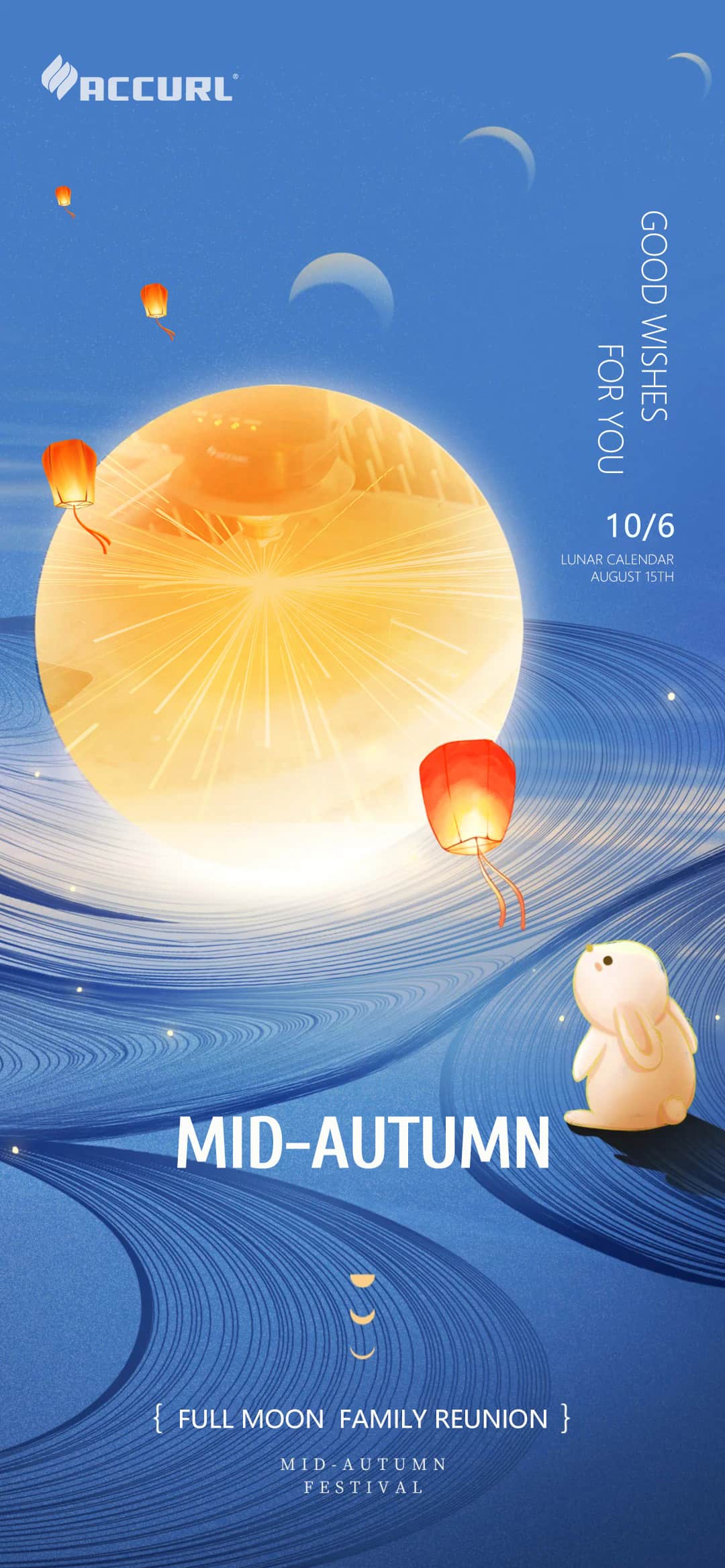 Chers employés et amis d'Accurl de tous horizons, je vous souhaite de profiter d'une joyeuse fête de la mi-automne, réunis avec vos familles et bénis de bonheur et de bien-être !